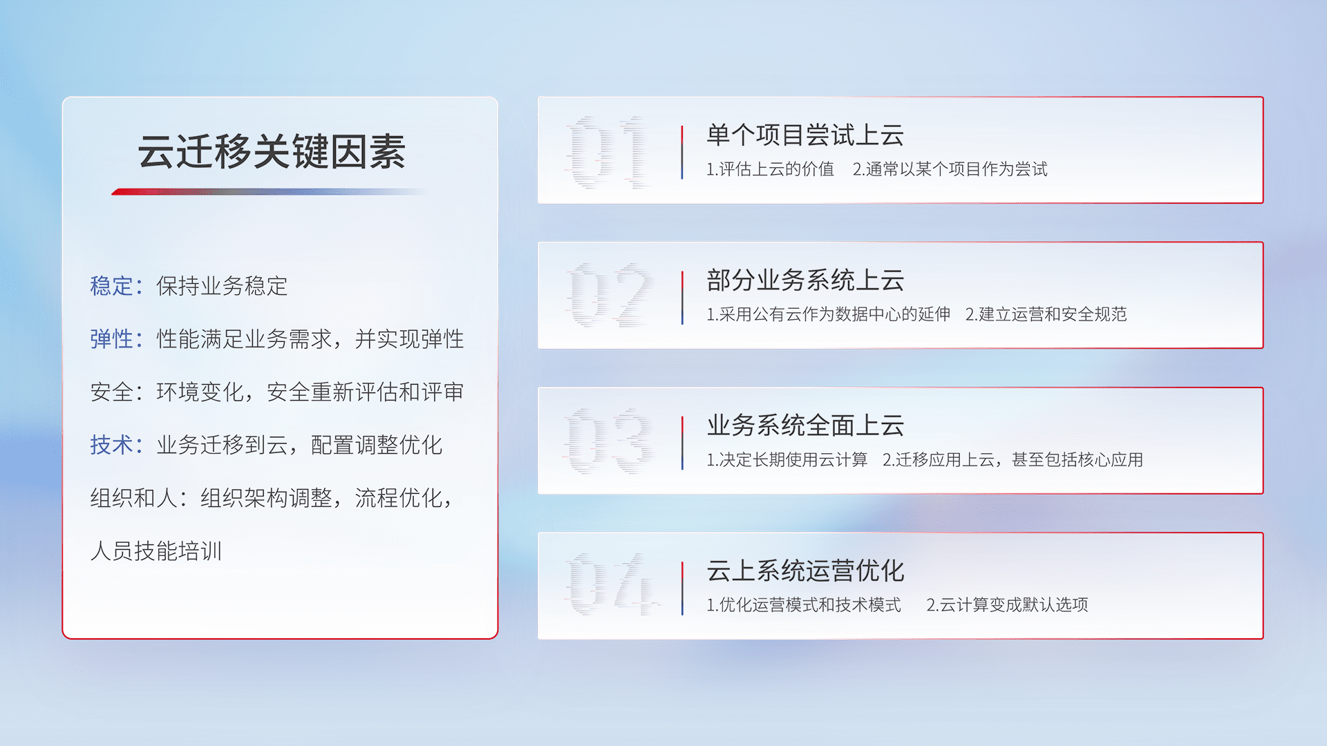 结合实际业务,,,,从规划设计、、云平台选型、、云原生改造、、、、数据迁移、、、、集成交付,,,迁移全过程为客户识别最佳上云路径,,,做好风险识别管理,,,,设计网络架构、、身份权限、、、安全审计合规、、、、操作审计、、、日志审计、、、监控告警策略、、、、多站点容灾设计等,,,对云上基础设施进行整体规划,,,提升IT治理水平,,,以满足弹性、、、高可用、、、高性能的需求。。。。