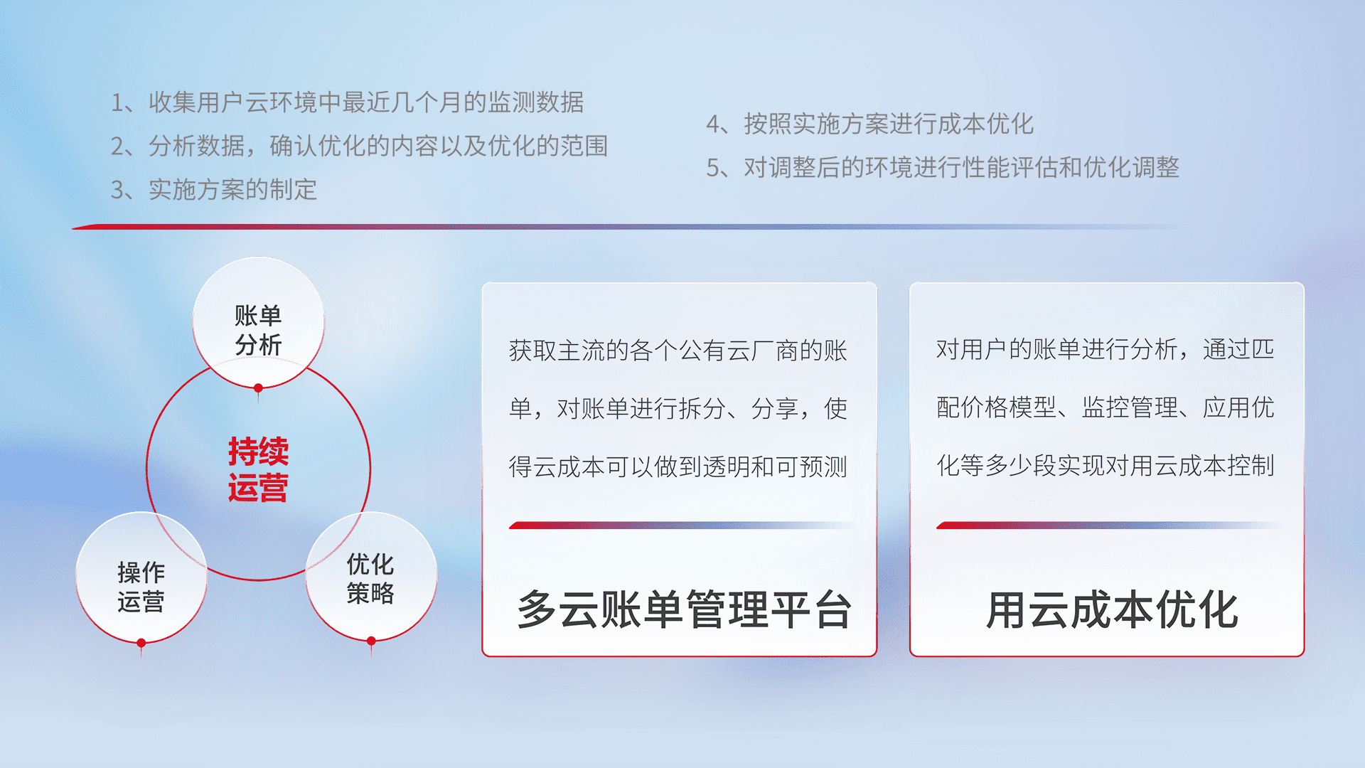 通过多云纳管,,以统一的资源数据模型把客户的云资源进行抽象和封装,,,进而实现对多云资源的统一操作,,保障云资源管理的可靠性、、、、稳定性与可用性。。。量身定制化运维内容,,,,配置、、开发运维、、、、补丁管理、、、、备份、、、监控、、认证和访问管理、、审计和日常巡检等,,,保障在用云过程中的可靠度,,,稳定度以及高可用率。。。。